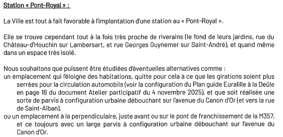 Il convient de rappeler que les élus de la MEL, dont le maire actuel de Lambersart, ont voté une première version du tracé qui empiète sur une partie du jardin du Pont Royal.