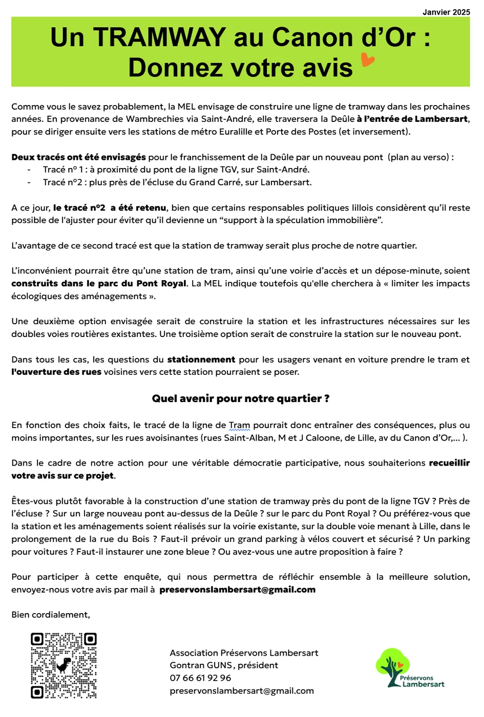 L’association Préservons Lambersart soutient la candidature de Gontran Guns, qui s’engage à faire annuler cette délibération et à agir auprès de la MEL afin que les deux stations de tramway soient implantées sur un pont enjambant la Deûle, conformément à la demande majoritaire des habitants du quartier.